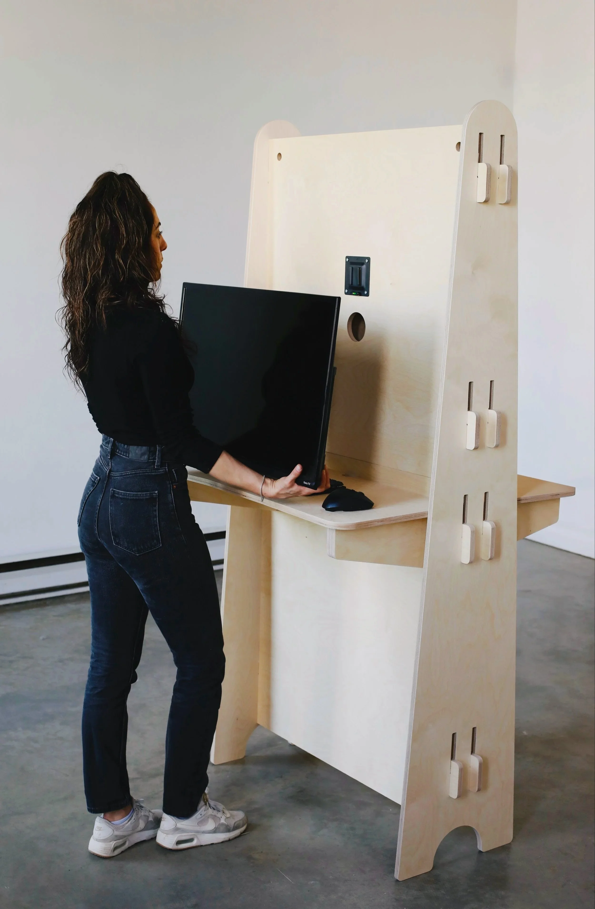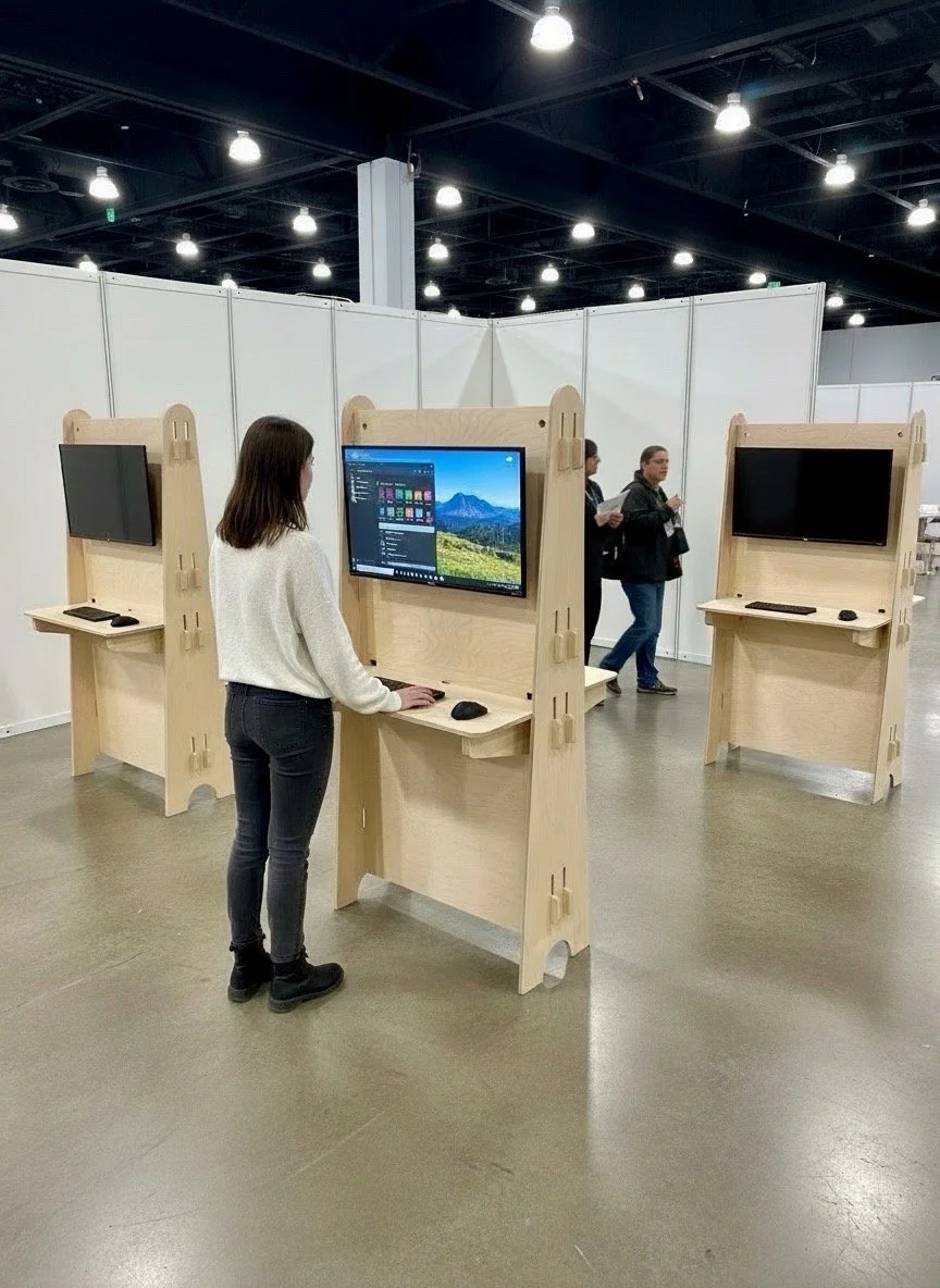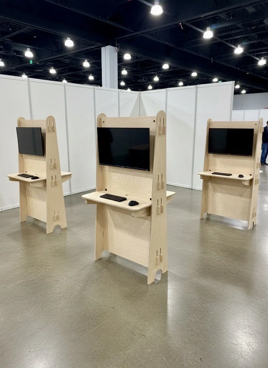 These tradeshow kiosk displays were designed to be double-sided, allowing HappyCo to maximize visibility from both directions of foot traffic. Precision-cut from high-grade plywood and finished in our signature clean aesthetic, each unit locks together through friction-fit joinery, creating a stable structure without screws, hardware, or tools.
