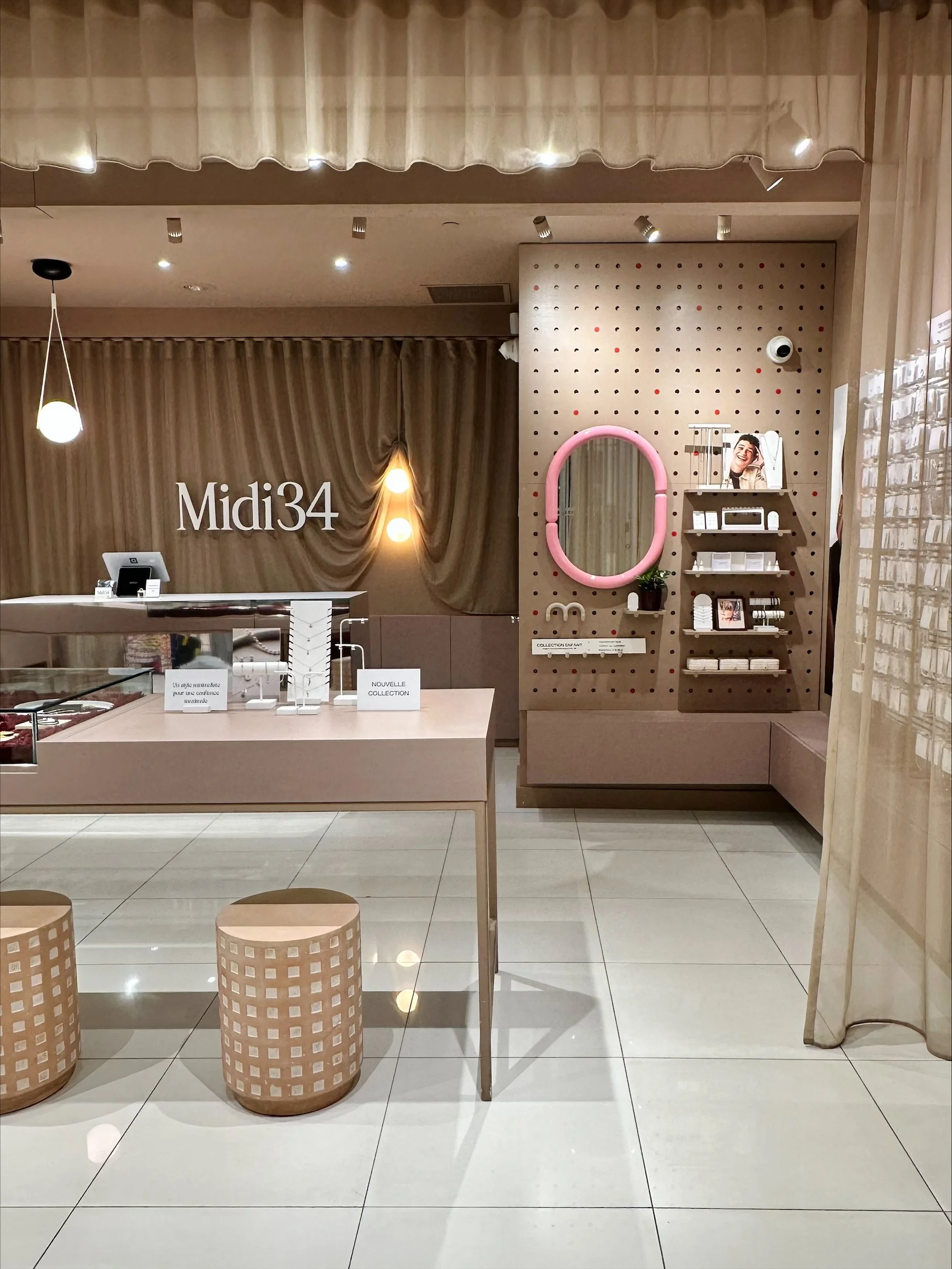 Midi34’s pegboard displays allow their minimalist jewellery to shine. By spacing out products and pairing them with subtle shelving, customers can focus on the craftsmanship of each piece.